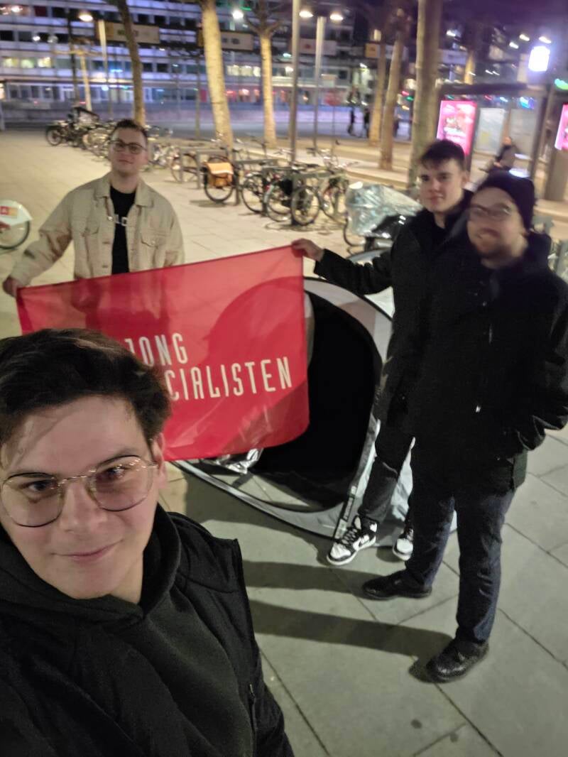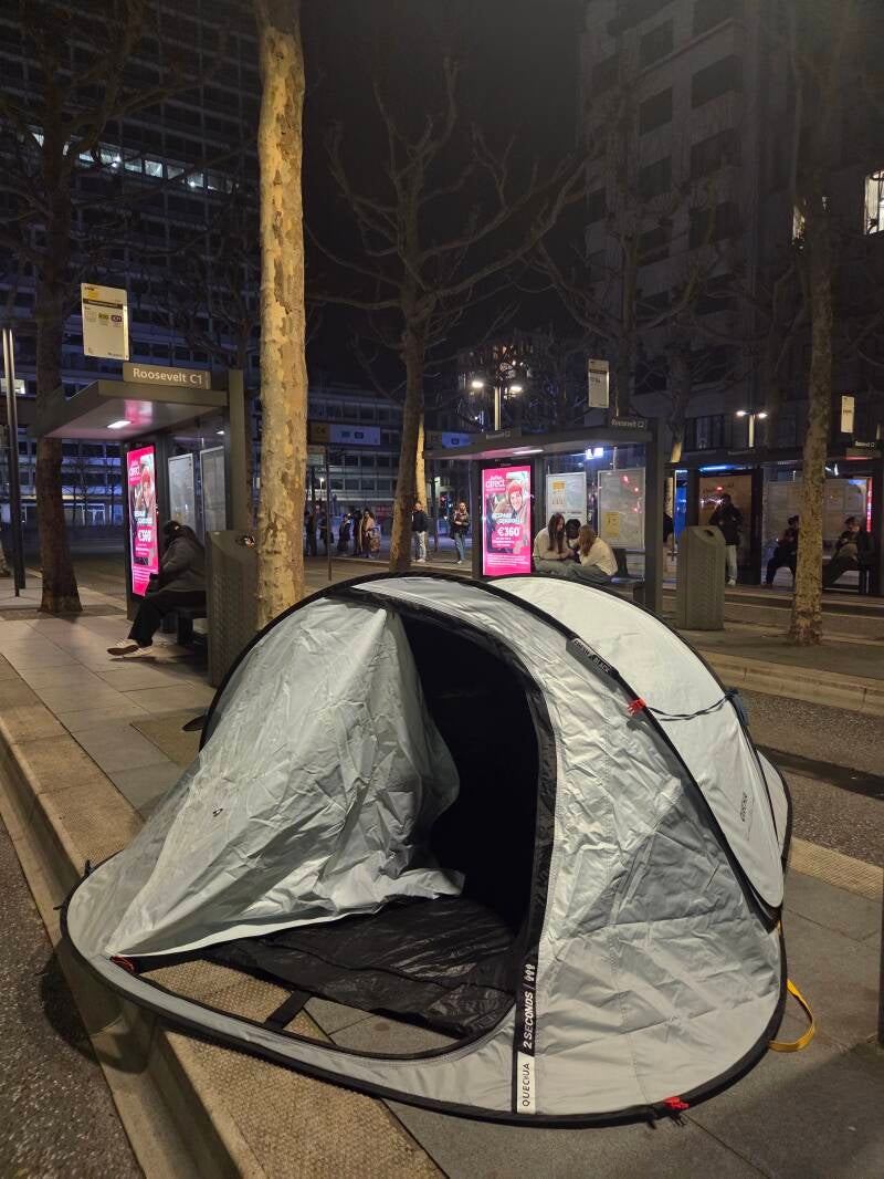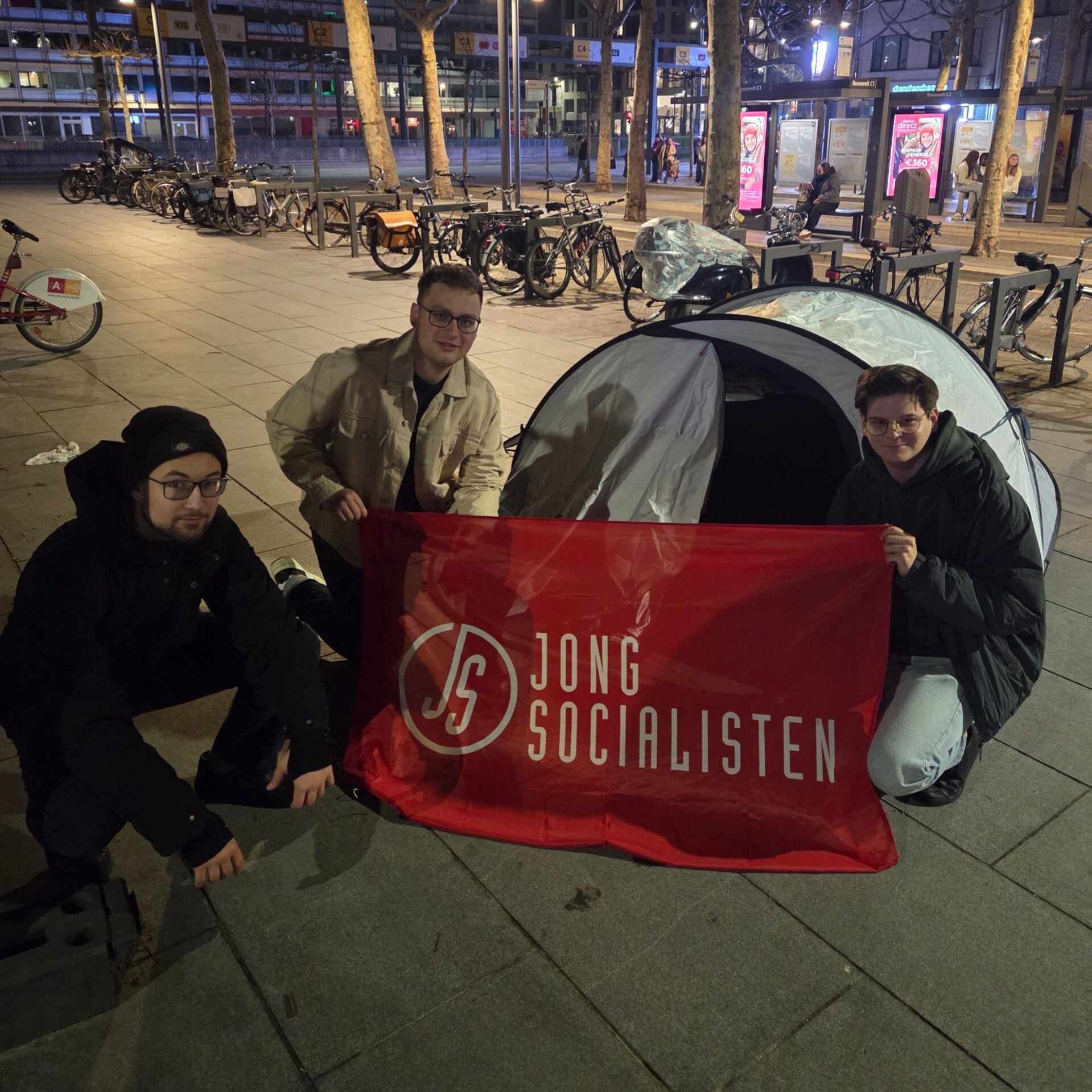 Antwerpen, [25/2/2026] — De Jongsocialisten Antwerpen voerden woensdagavond actie aan de Rooseveltplaats. Met opgezette tentjes willen ze aantonen hoe jongeren, uitgaande Antwerpenaars en nachtwerkers zich vaak genoodzaakt voelen om “hun tent op te zetten” omdat er na middernacht geen bussen of trams naar hun woonplaats meer rijden. Met de kampeeractie vragen ze aandacht voor het invoeren van nacht openbaar vervoer in Antwerpen.